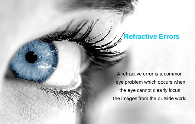 Types of refractive errors are, myopia (nearsightedness), hyperopia (farsightedness), presbyopia (loss of near vision with age), astigmatism (distorted shape of cornea curvature), amblyopia (lazy eye) and strabismus.( squinting of the eyes).